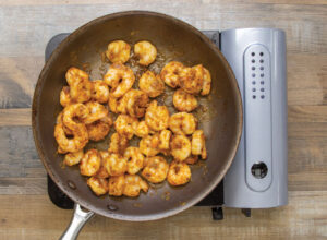 After peeling and deveining the shrimp, pat them dry, toss them in a bowl with one tablespoon of Grapeseed Oil and 1-1/2 tablespoons Taco Seasoning until evenly coated. Then sauté in a large skillet about 2-3 minutes on each side, until the shrimp are pink and opaque.
